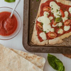 Pizza de Casabe con Tomates, Albahaca y Mozzarella