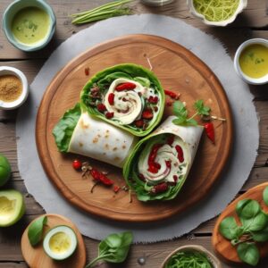 Este rollito verde de espinacas es una opción fresca y saludable, ideal para un almuerzo ligero o una cena rápida. El relleno de lechugas mixtas, tomates secos, alfalfa, pepino, queso crema y mozzarella, aderezado con albahaca y aceite de oliva, ofrece una explosión de sabores y texturas en cada bocado.