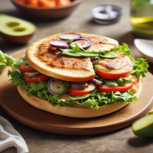 Este pita relleno es una opción saludable y deliciosa, perfecta para un almuerzo ligero o una cena rápida. La combinación de salmón, aguacate y vegetales frescos, aderezados con aceite de oliva, ofrece un sabor fresco y nutritivo.